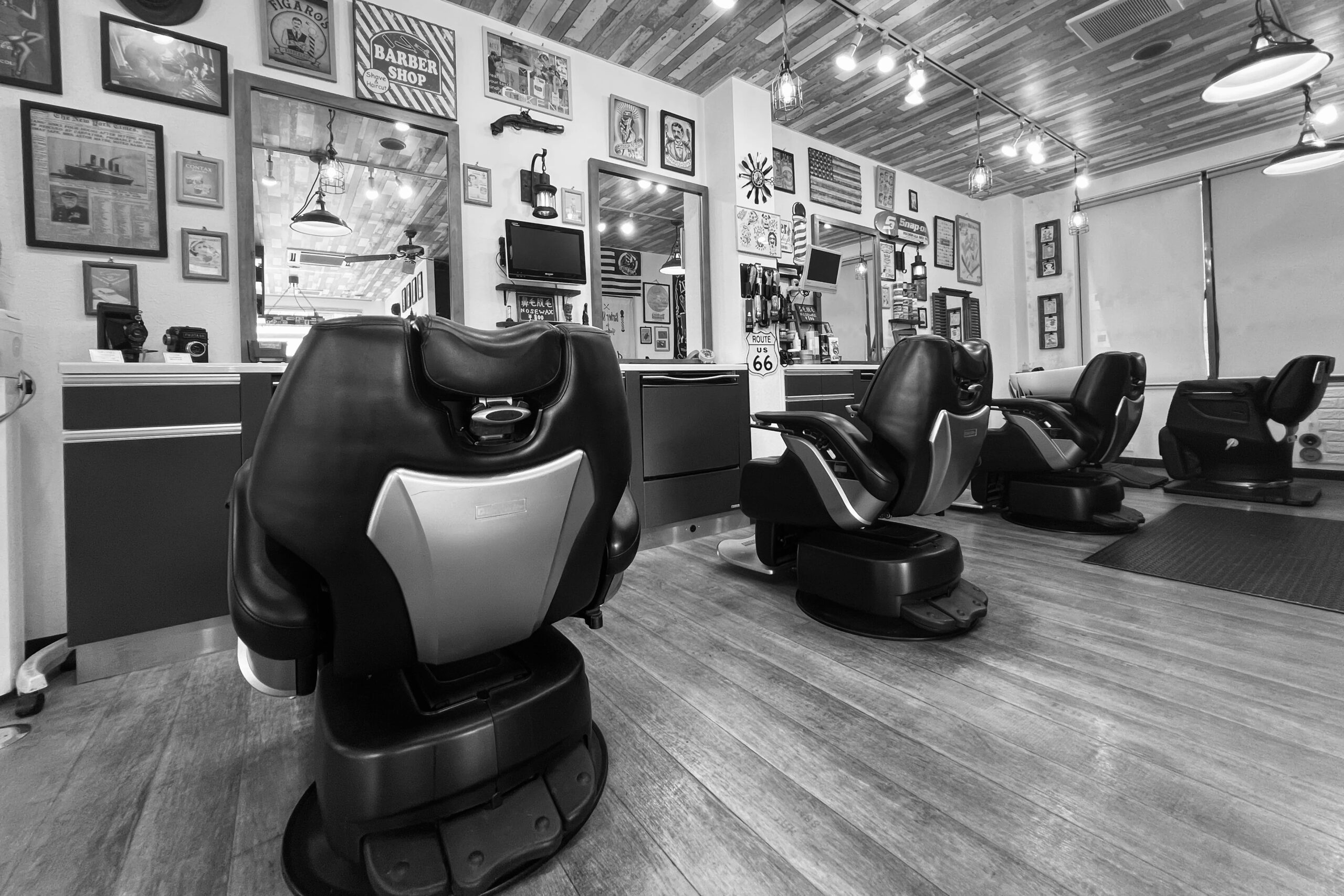 当サロンは、アメリカンヴィンテージを基調とした空間が魅力のバーバー。ウッド調の天井、そしてクラシックなポスターやバーバーサインが壁を彩り、まるで海外のガレージを思わせるスタイリッシュな雰囲気が漂う。黒のバーバーチェアが整然と並び、温かな照明が落ち着いた時間を演出し、理容の伝統とストリートカルチャーが融合した、地域に愛される空間だ。