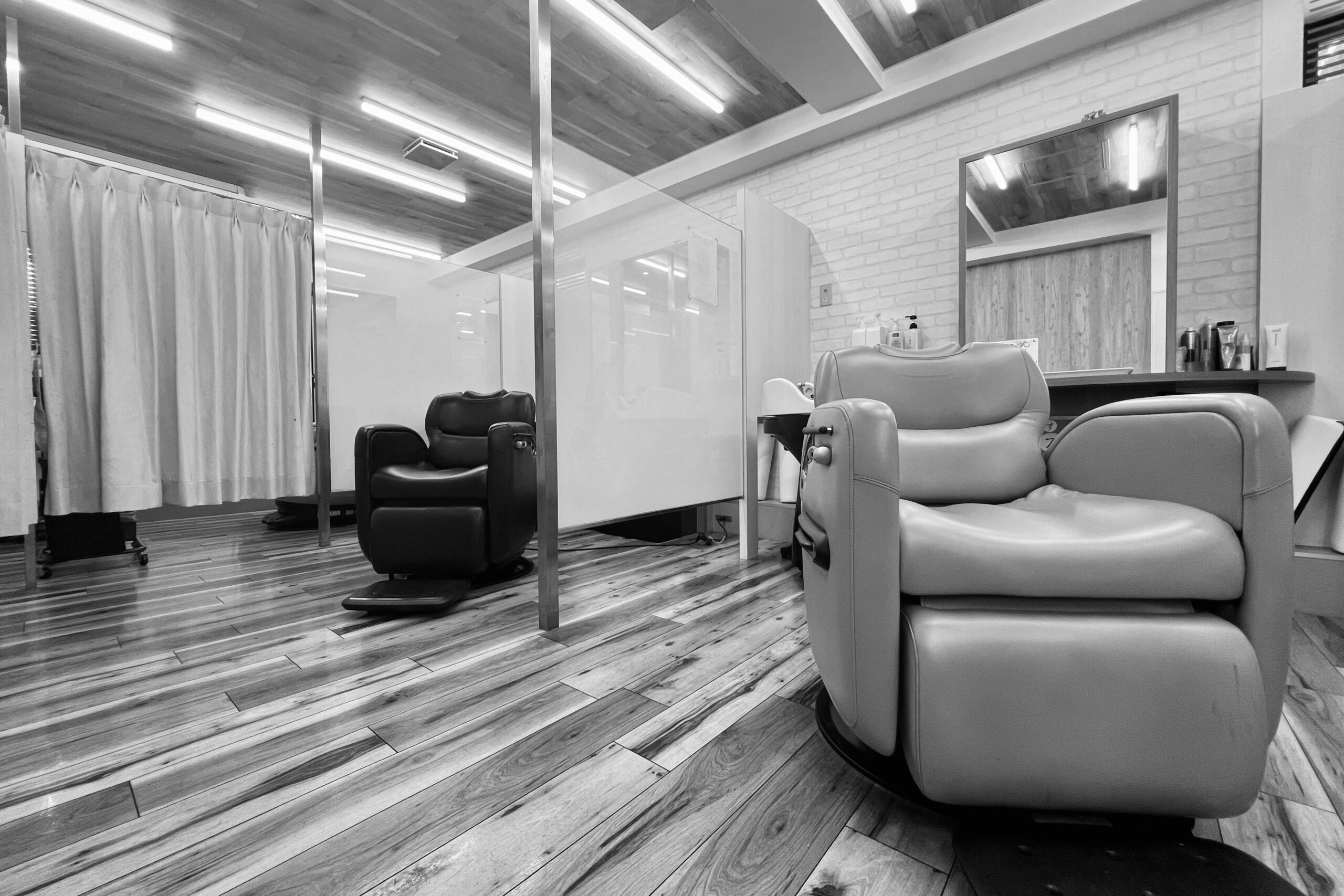 当サロンは、明るいウッドフロアと温かみのある照明に包まれた落ち着いた空間だ。ブースごとに仕切られた半個室には、ゆったりと座れる理容椅子を配置。オレンジやブラウンのレザーが映える椅子は、高級感と安心感を兼ね備え、心からリラックスできる雰囲気を演出している。プライベート性の高いスタイルで、周囲を気にせず自分だけの時間を過ごせるのが大きな特徴だ。