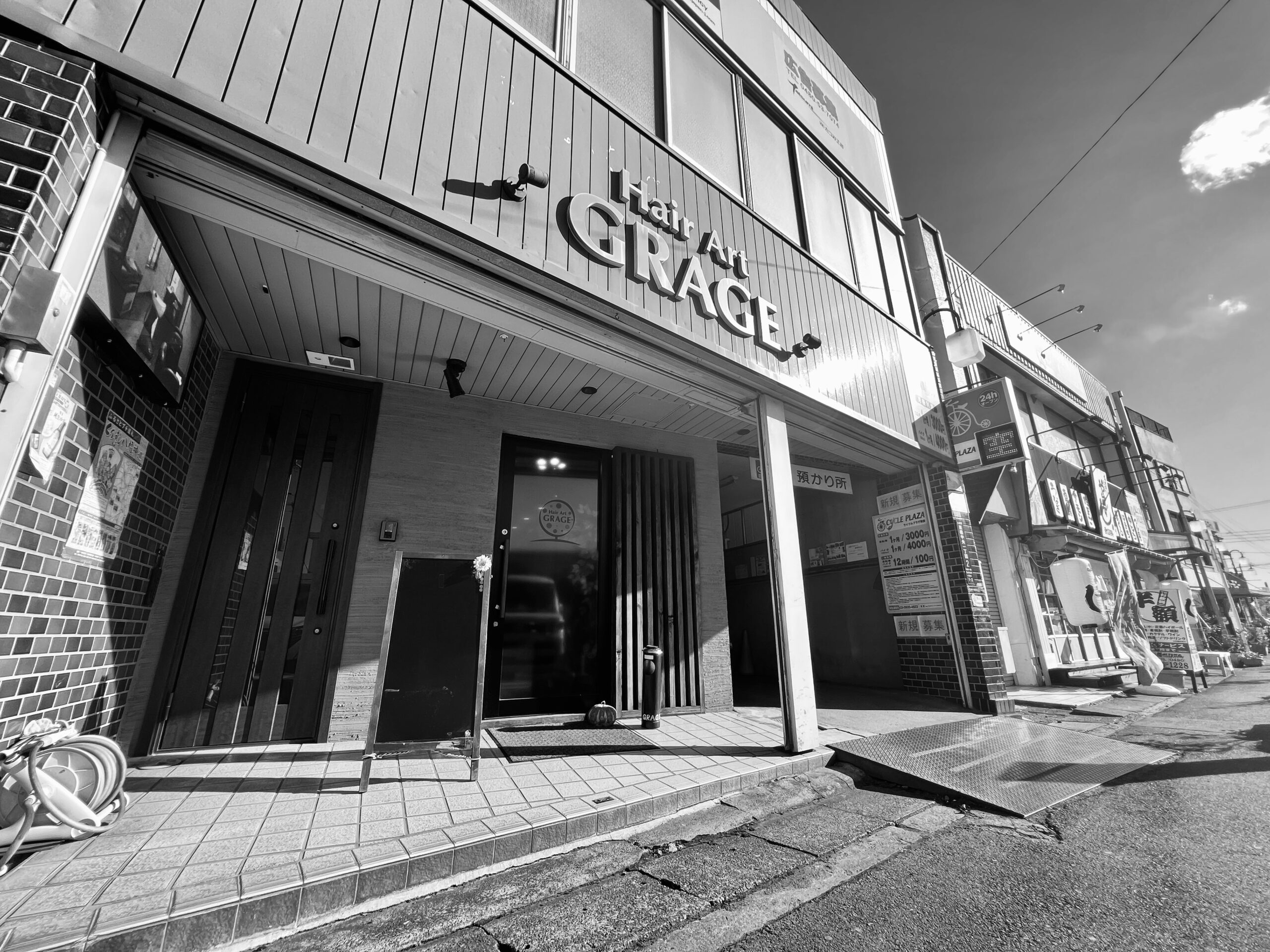 まずはサロンへの道順をご案内しよう。駅からは徒歩1分もかからない。栗橋駅東口を出て、目の前に飲食店や学習塾が並んでいる一画にサロンが見えてくる。「Hair Art GRAGE」と大きくサロン名が見えるのですぐに見つかるだろう。