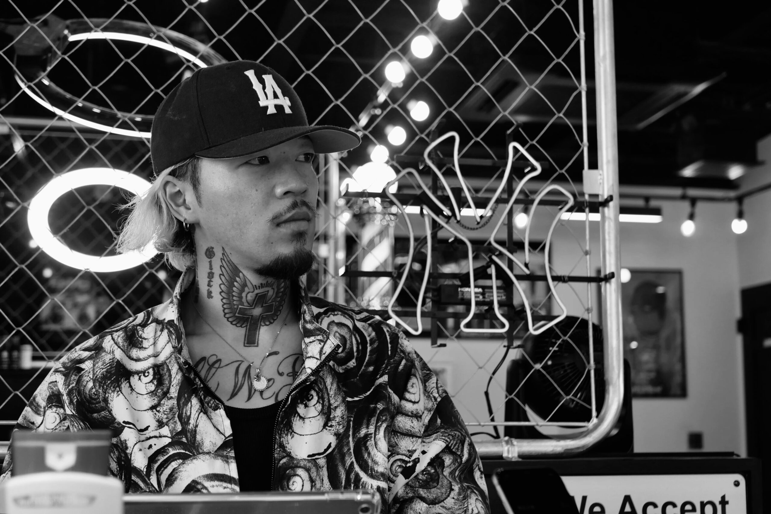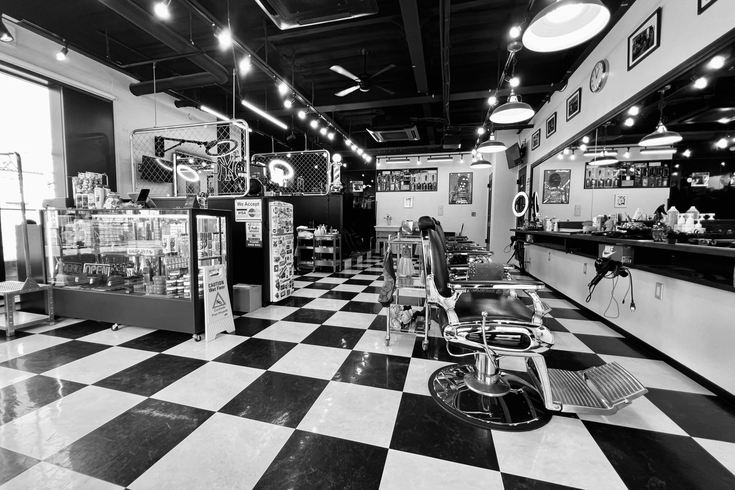 店内はブラック×ホワイトのチェッカーフロアが印象的で、まるでアメリカのガレージをそのまま再現したような空間。ネオンライトとメタルパーツが映えるインダストリアルな雰囲気の中に、ヴィンテージチェアが静かに佇む。壁にはクラシックな写真やバーバーサインが並び、無骨さとスタイルが絶妙に共存している。音、光、香り──そのすべてが“ストリートカルチャー×バーバー”の世界観を体現したサロンだ。