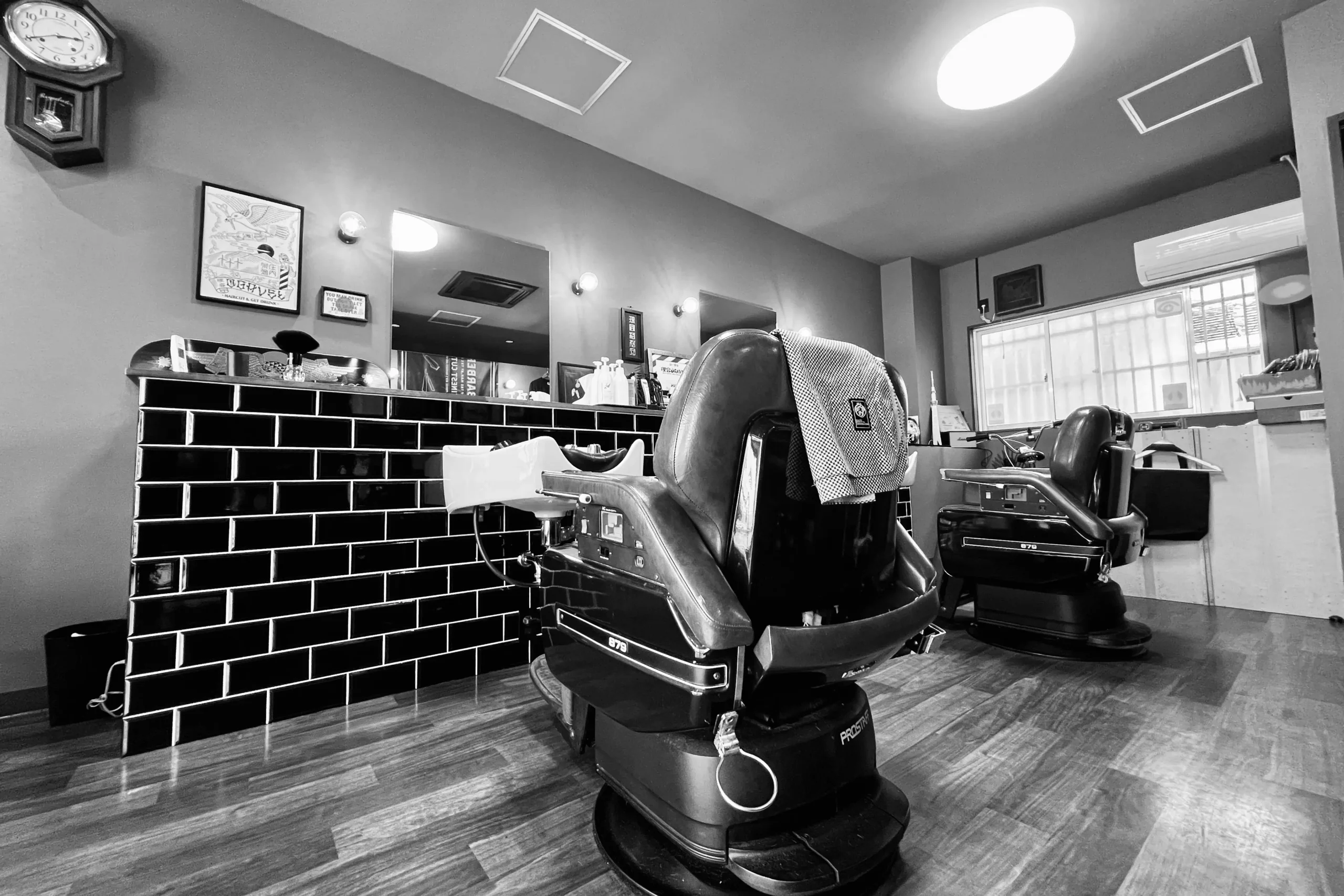 当サロンは、ストリートカルチャーとクラシックバーバーの空気を共存させた、独自の世界観を持つ理容室。壁面にはアートデッキやポップアートが並び、ニュアンス照明が空間に深みを加える。カットブースには存在感のあるヴィンテージバーバーチェアを配し、スタイルづくりに集中できる環境を整えている。居心地の良さを保ちながら、無駄を削ぎ落としたレイアウトが特徴だ。落ち着いた照明の中、ラフすぎず、気取らず、自然体で過ごせる場所――それが当サロンだ。