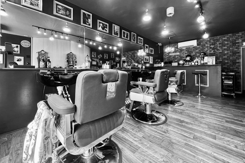 当サロンは、深いグリーンを基調とした空間に重厚感のあるバーバーチェアが並ぶ、スタイリッシュな理容室。ウッド調の床とレンガ壁が落ち着きを生み、クラシックとモダンが心地よく混ざり合っており、壁面には写真やアートがリズムよく配置され、ひとつの世界観をつくり上げている。照明は必要以上に明るすぎず、施術に集中できる落ち着いたトーン。カウンター周りのディスプレイにもこだわりがあり、空間全体に“バーバー文化”への敬意が漂うサロンだ。