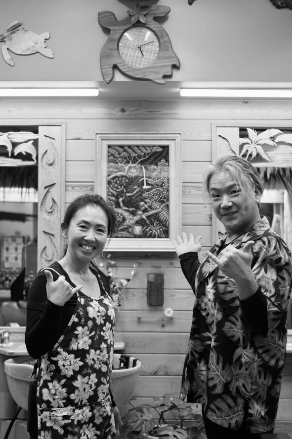 街の喧騒から少し離れたその場所で、南国の空気を感じるサロンが静かに迎えてくれる。ご夫婦共通の“好き”をかたちにした店内は、ハワイをテーマにした落ち着いた空間。まるで旅先を訪れたかのような、心がほどけるような時間が流れている。「癒やされる空間」であることを大切にしてきたという藤田ご夫妻。髪を整えるだけでなく、気持ちまでやわらぐような時間を届けたいという思いが、店の隅々から伝わってくる。さらに注目したいのが、環境に配慮したサロンづくりへの姿勢だ。海を汚さない洗剤の使用や、アレルギーへの配慮を意識したタオル洗濯の取り組みなど、日々の業務に自然と寄り添う工夫がちりばめられている。ハワイと日本、自然と人をやさしくつなぐような営みは、藤田あゆみさんが“理容師であり環境活動家でもありたい”という想いを体現しているようにも感じられる。 お店の雰囲気を感じていただいたところで、ここからは藤田ご夫妻へのインタビューをお届けしよう。